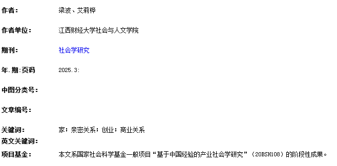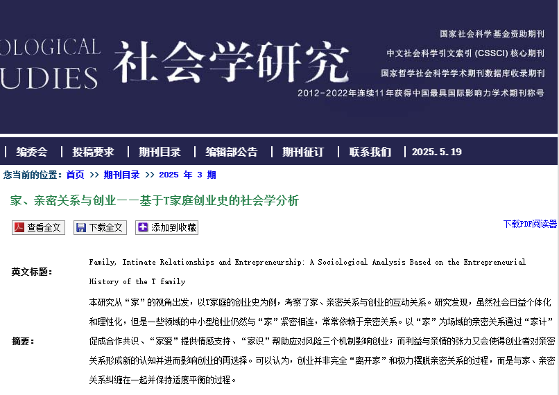近日,国产自拍在线观看 博士生导师梁波教授与其指导的硕士研究生艾莉桦同学合著的论文《家、亲密关系与创业——基于T家庭创业史的社会学分析》发表于国内著名权威期刊《社会学研究》2025年第3期。该文是我校社会学学科建设的又一篇重要研究成果。